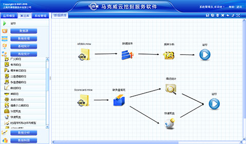 馬克威云挖掘軟件是數(shù)據(jù)分析軟件中以分布式架構(gòu)的大型統(tǒng)計(jì)分析和數(shù)據(jù)挖掘軟件,具有完全自主知識(shí)產(chǎn)權(quán)(備案號(hào)2013SR092246)。馬克威云挖掘軟件能夠獲取云端數(shù)據(jù),如: HADOOP平臺(tái)、阿里云飛天平臺(tái)等,通過數(shù)據(jù)挖掘和統(tǒng)計(jì)分析算法建立概念模型,從海量數(shù)據(jù)中尋找規(guī)律和知識(shí),為決策者提供科學(xué)的決策依據(jù)。目前運(yùn)行單張表數(shù)據(jù)量為3.4T,處理速度為36秒左右。